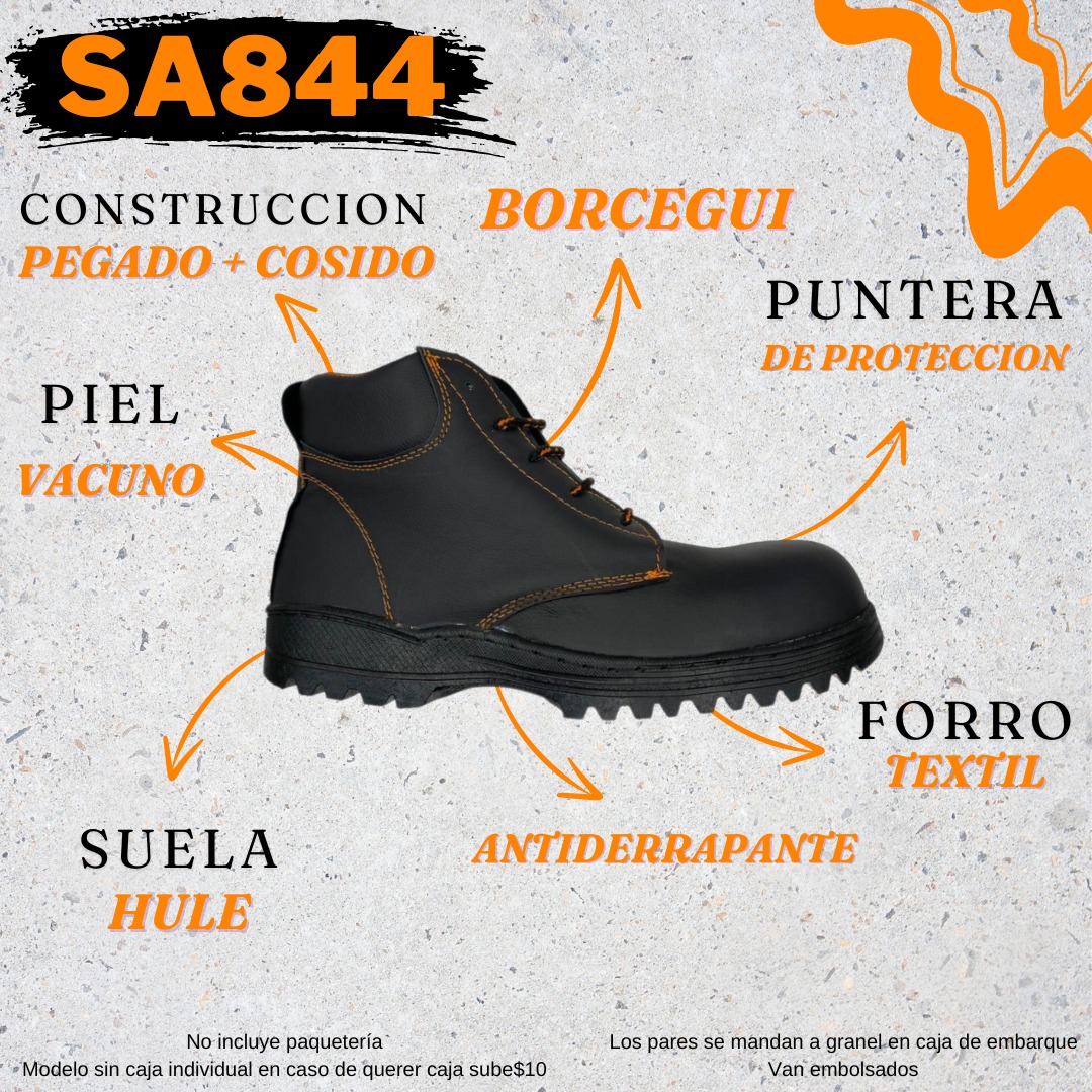 Bota se seguridada tipo Borcegui con puntera de protección , piel de res vacuno, suela de hule antiderrapante, y forro textil. Costuras pegado y cocino .
